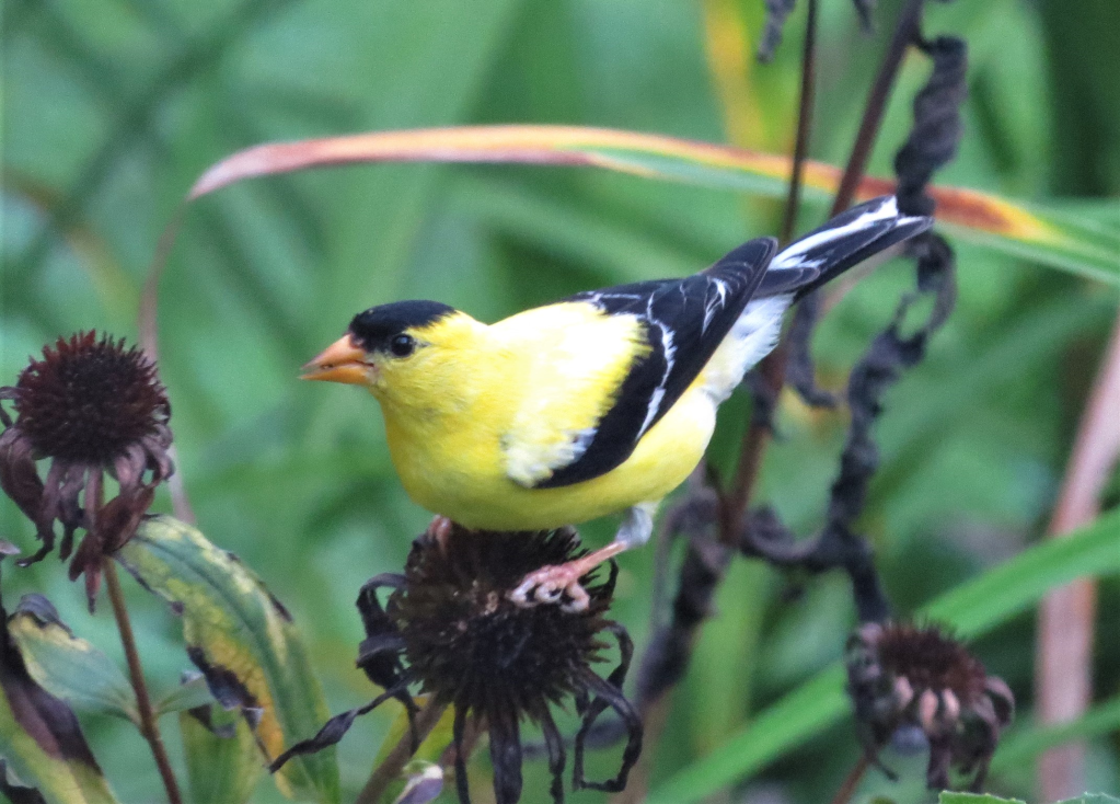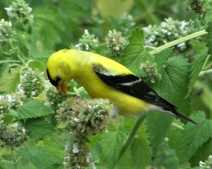 Though I seldom see goldfinches drinking or bathing at my birdbath, an unexpected consequence of hanging hummingbird feeders is the pleasure of watching goldfinches leaning in to drink water from the ant-wells. Another surprising appropriation: catnip grown for our cats provides food for the birds. Stems of catnip start bobbing and there’s a goldfinch or two, climbing around on the plants or head-down deep in succulent catnip seeds. (Catnip is a mint that spreads easily, so I wouldn’t plant it unless you want to delight your cats.)