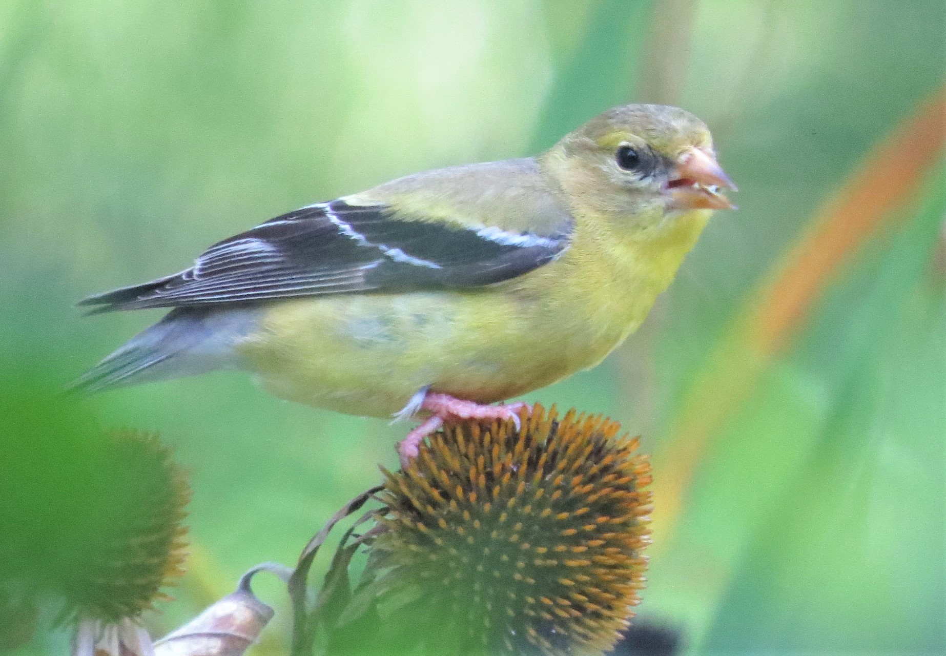 Like all birds, goldfinches need food, water, and shelter to survive. Not deep-forest birds, they prefer open woodlands, weedy areas and meadows, and streamsides, with shrubs for cover and nest sites. These little birds are vegetarians: their diet consists almost entirely of seeds. Unlike most seed-eating birds, they seldom feed insects to their nestlings, but stuff those noisy gaping beaks with regurgitated seeds. They especially like thistle seeds, and also use soft thistle and cattail down to line their nests. Thistles flower later in summer, so goldfinches nest later than many other garden birds.