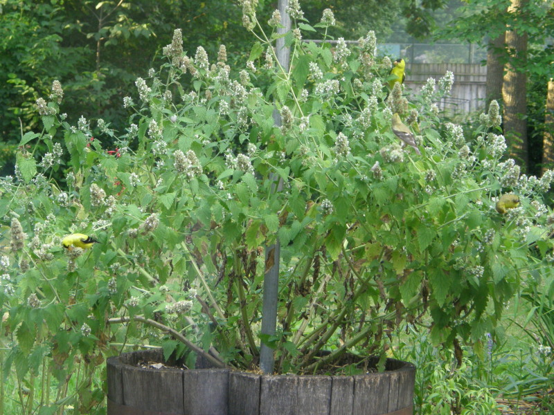 An unexpected benefit is that when the catnip blooms and sets seeds, American goldfinches arrive to partake, bobbing among the blossoms. For us, it’s a two-fer.